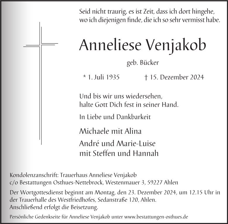 Leider können wir aus gesundheitlichen Gründen nicht an der Trauerfeier und an der Beisetzung von Anneliese teilnehmen.